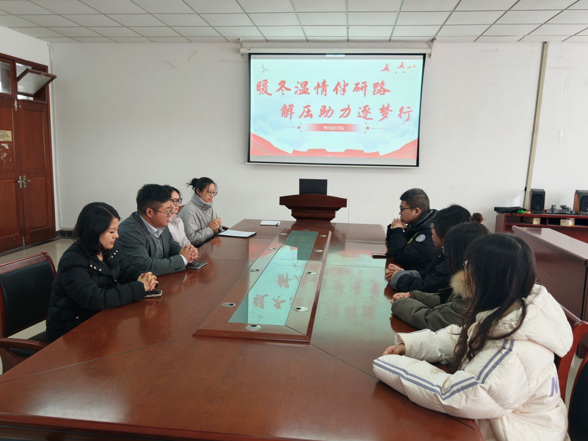 “长风破浪会有时,直挂云帆济沧海。”2026年全国硕士研究生招生初试冲刺的号角已然吹响,为帮助2022级考研学子缓解备考压力、明晰冲刺方向,三上悠亚视频 于12月4日中午在德正楼308举行了“暖冬温情伴研路,解压助力逐梦行”的考研慰问活动。三上悠亚视频 党委副书记孙大松老师、三上悠亚视频 学工办主任李超雅老师、2025级研究生代表以及2022级考研学生代表参加活动。