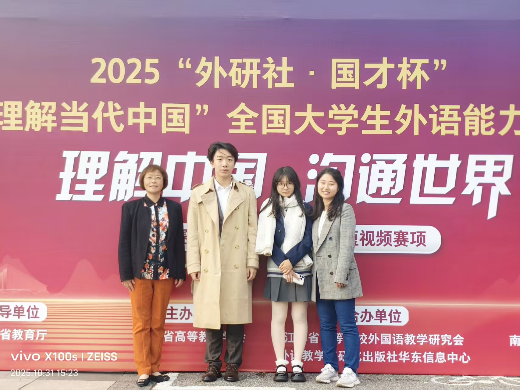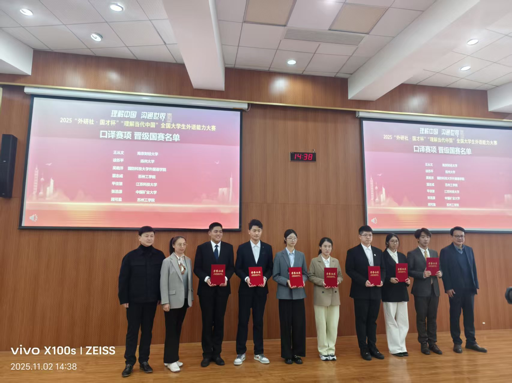 10月25日—11月2日,2025“外研社·国才杯”“理解当代中国”全国大学生外语能力大赛江苏赛区英语组系列比赛分别在南京农业大学和南京航空航天大学举办。经过激烈角逐,我校学子荣获口译省赛一等奖并晋级国赛,另有多名同学分获综合能力,演讲和笔译的省赛一、二、三等奖。